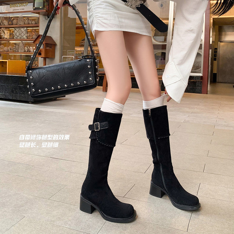 2025 autumn and winter new British round head fashion belt buckle high-heeled knight boots women's versatile side zipper thick-heeled boots