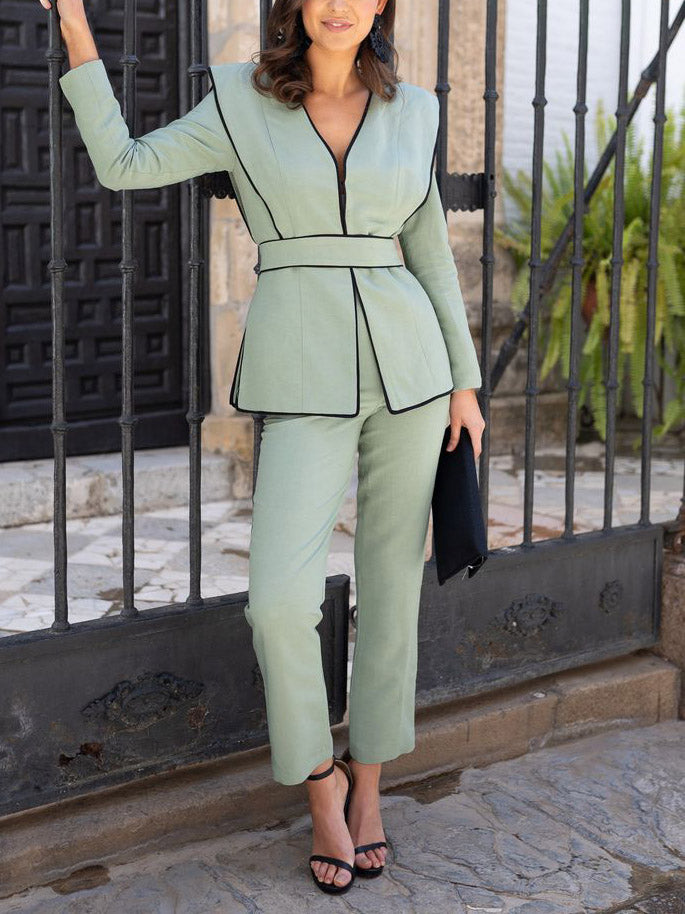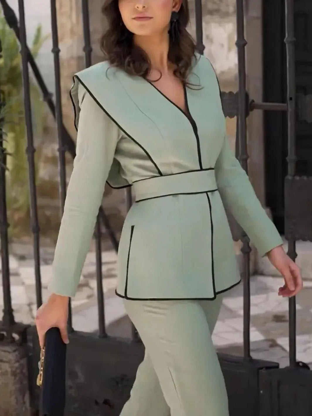 Effortlessly stylish, this long-sleeved V-neck shirt features clean black piping details for a touch of contrast. Its relaxed fit and soft fabric make it a versatile essential for both workdays and weekends. Pair it with matching pants for a coordinated look.