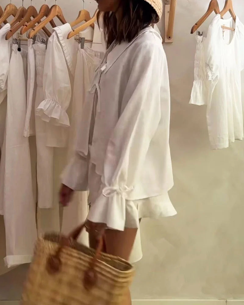 Casual Solid Cotton Linen Lace-Up Top & Shorts Two-Piece Set