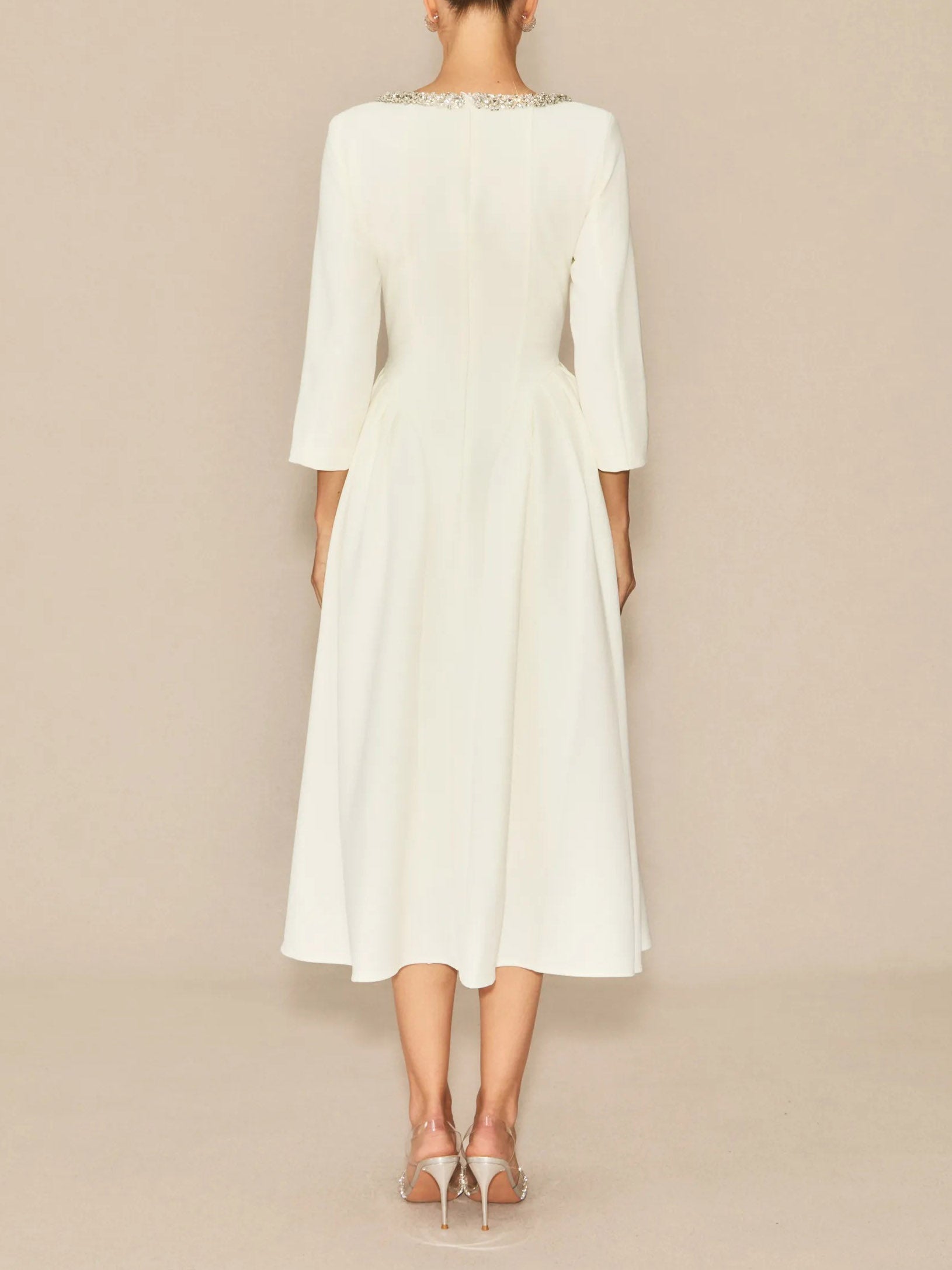 This elegant, crystal-embellished midi dress exudes refined charm.