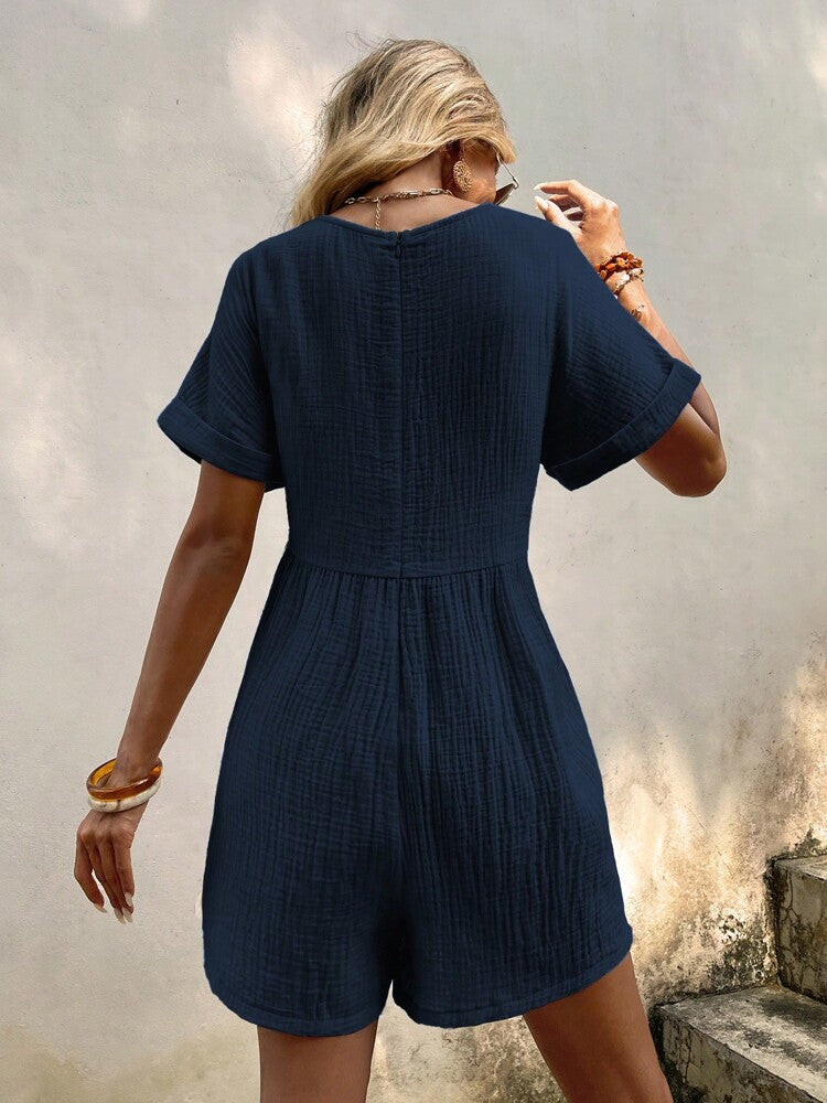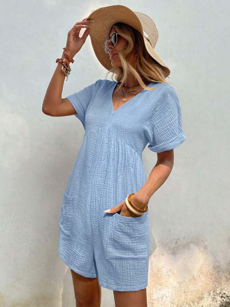 Fashion Solid Color V-neck Loose Bat Sleeve Zipper Short Sleeve Jumpsuit