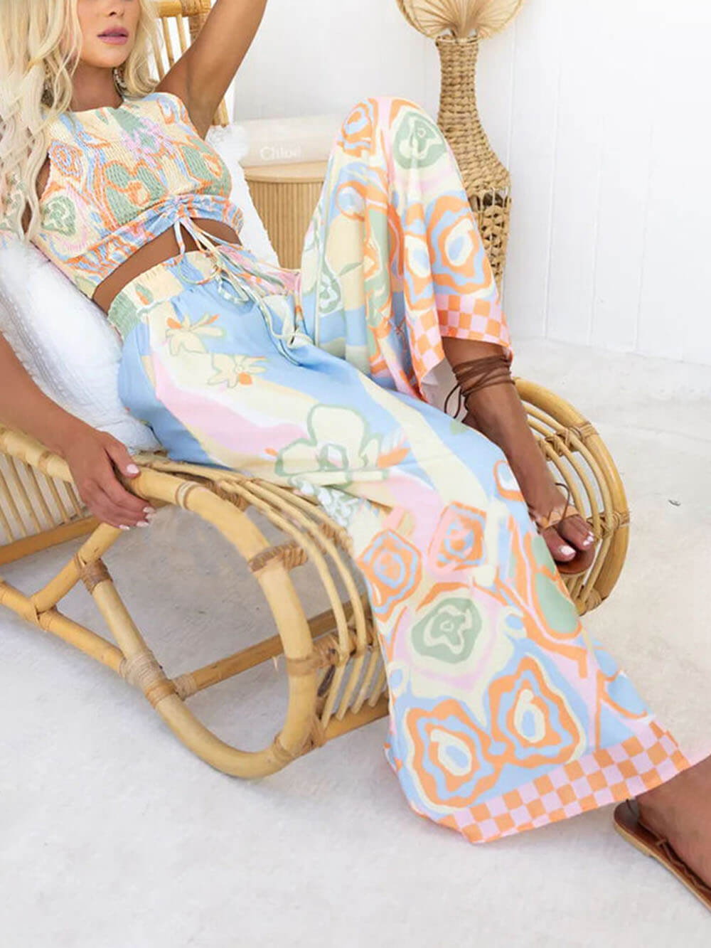Floral Print Smocked Adjustable Tank Top Drawstring Wide Leg Pants Set
