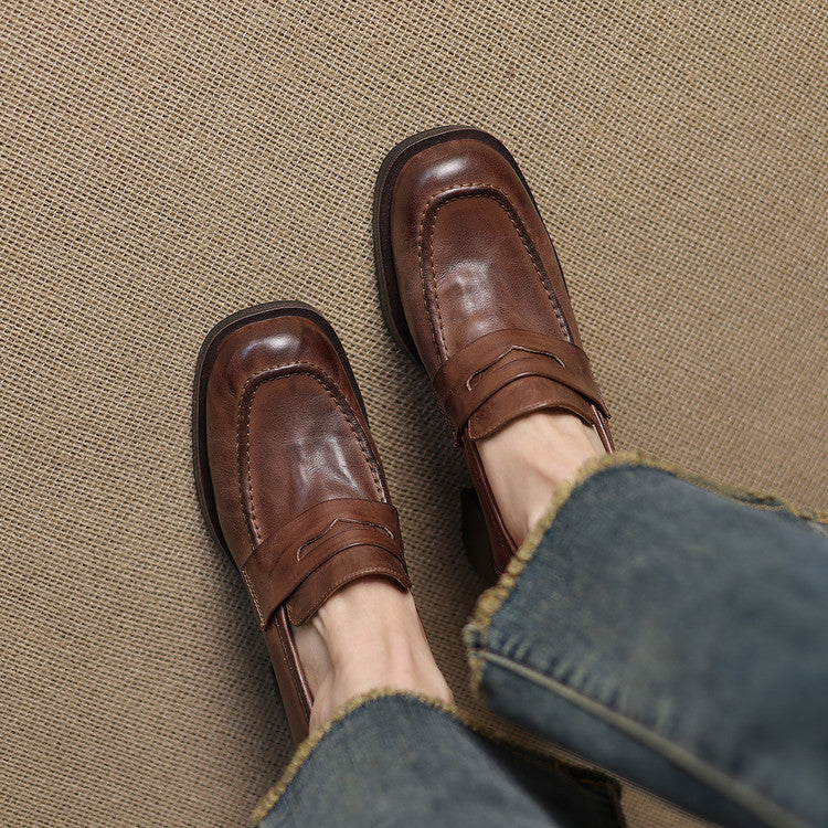 Retro full leather thick heel deep mouth casual loafers women's 2025 autumn new one-pedal high-heeled commuter shoes