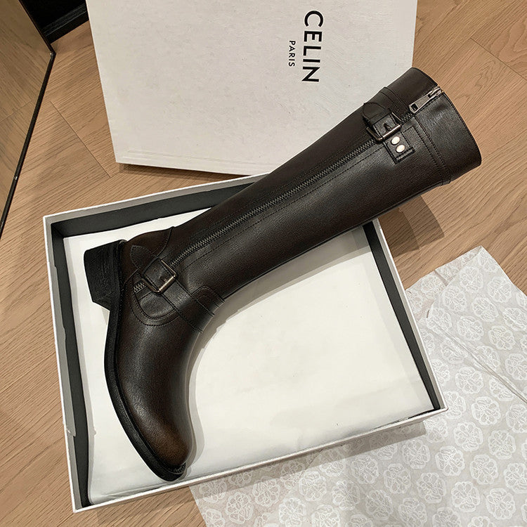 Skinny and versatile thick-heeled knight boots women's boots 2025 winter new round head trendy cool belt buckle middle heel but knee boots