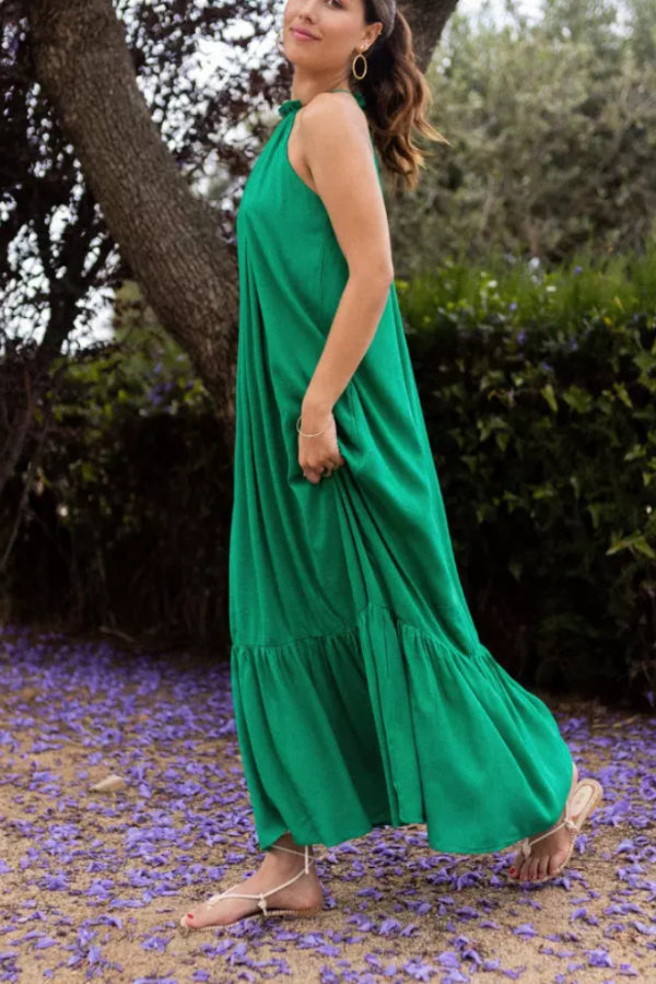 - Vestido largo liso de color verde esmeralda.